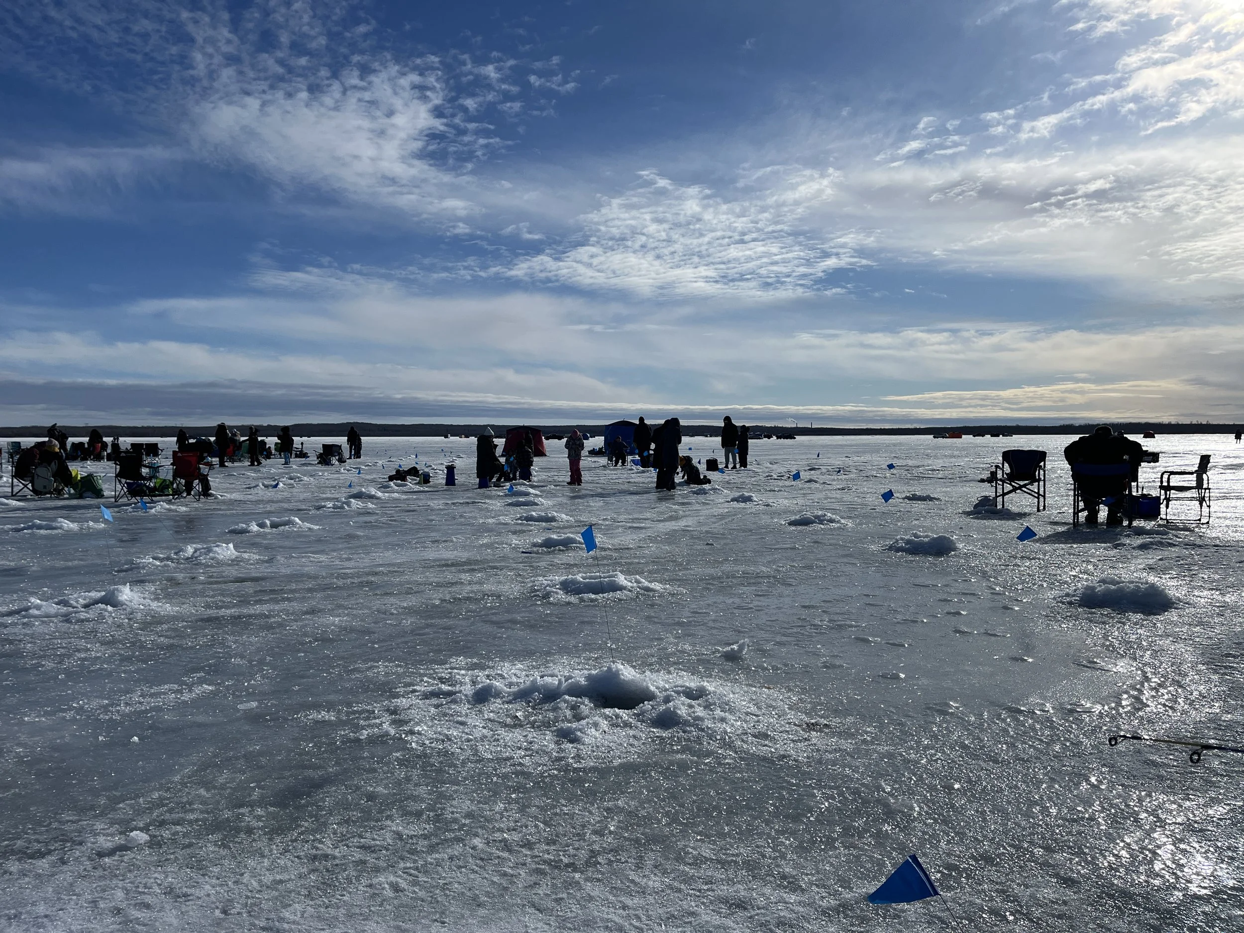 The fishing holes are drilled by huge augurs for the children to fish in.
